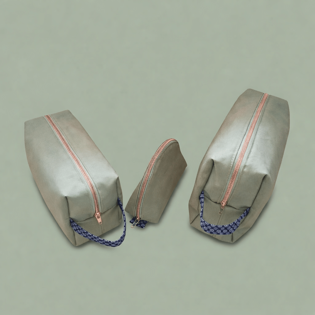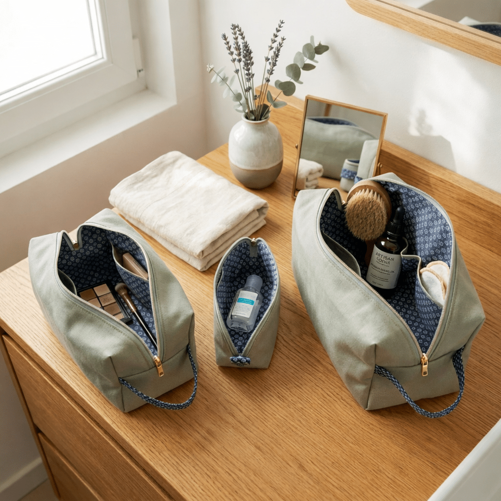 Cet ensemble artisanal de 3 trousses en coton épais a été conçu pour sublimer votre quotidien et vos voyages. Trois formats complémentaires pour que chaque objet trouve sa place, du flacon de shampoing au petit bijou précieux.